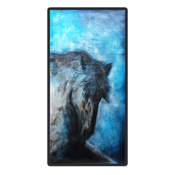 Un imponente caballo en tonos azules y grises emerge sobre un fondo etéreo, transmitiendo fuerza, nobleza y melancolía. Los matices fríos envuelven la figura con un aire de misterio, mientras la textura acentúa la vitalidad del animal. Blue Horse es un homenaje a la elegancia y la profundidad espiritual de este ser majestuoso.