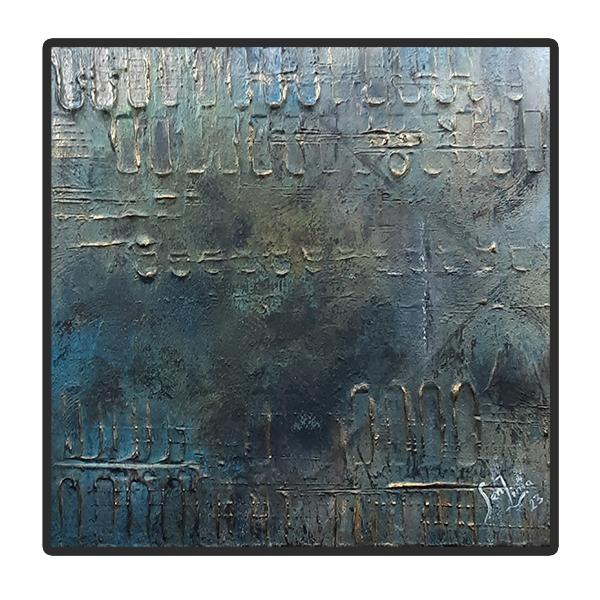 Una superficie cargada de texturas en tonos oscuros y metálicos revela formas casi jeroglíficas, como huellas de tiempos antiguos. La obra transmite solemnidad y profundidad, evocando la idea de que la historia, con todas sus marcas y misterios, pertenece a un dueño supremo que la trasciende.