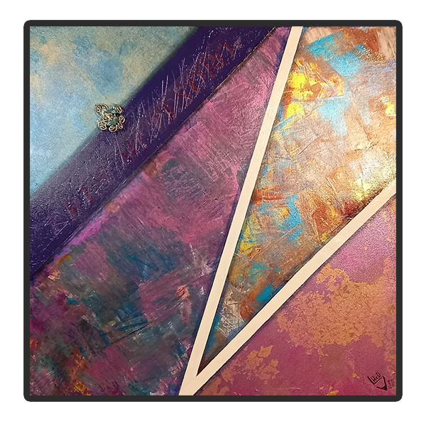Un juego de planos geométricos en tonos púrpura, turquesa y dorado se entrelaza con texturas brillantes que evocan riqueza y espiritualidad. En la esquina, un adorno metálico resalta como joya simbólica, recordando el valor único y precioso de cada ser. Eres mi especial Tesoro transmite una visión de belleza y singularidad envuelta en luz.