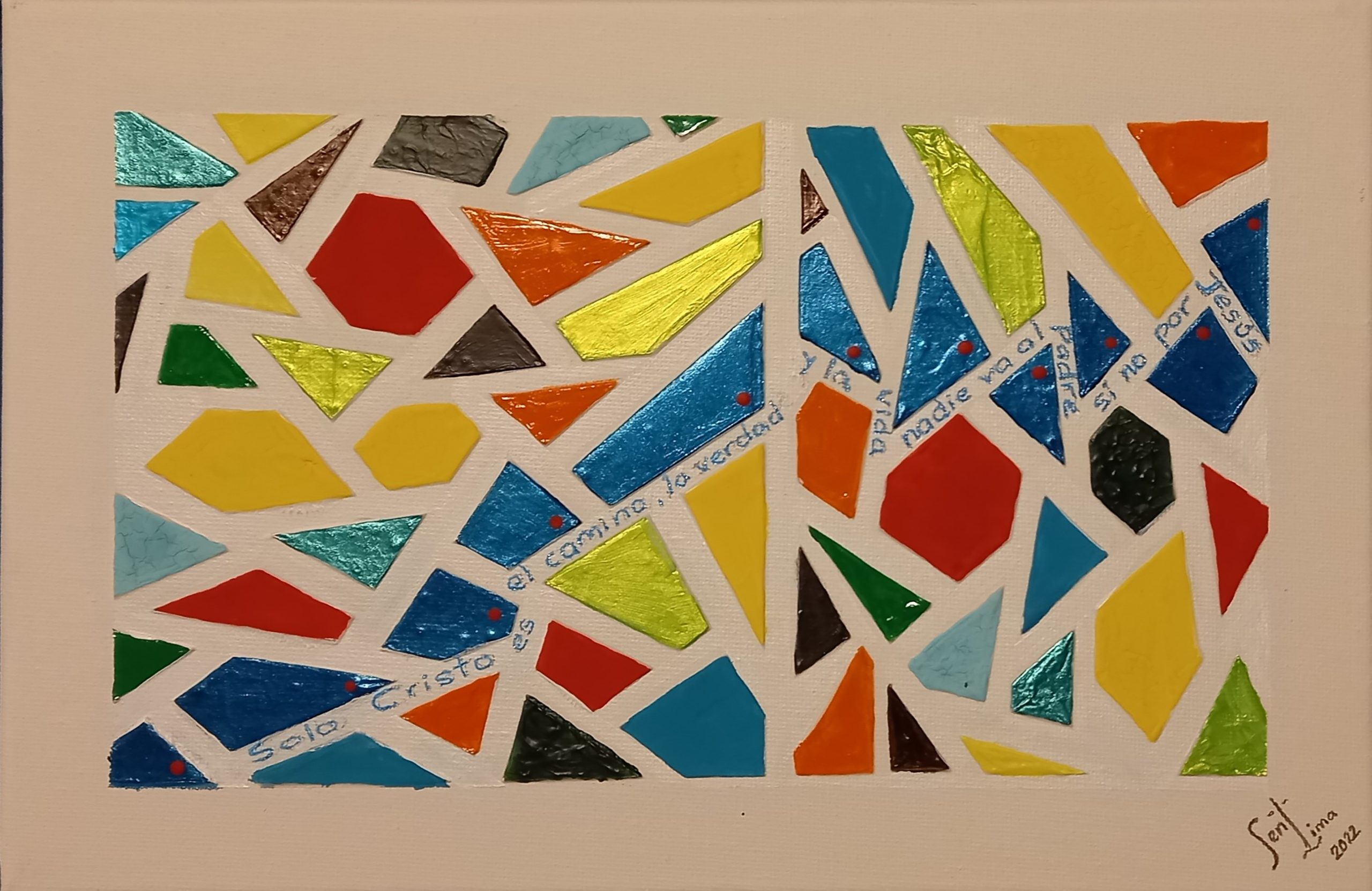 Una composición vibrante de formas geométricas que evocan un mosaico contemporáneo. Los colores intensos —amarillos, rojos, azules y verdes— transmiten energía y esperanza, mientras que las líneas blancas crean un orden que guía la mirada. En su interior, un mensaje espiritual emerge: “Sólo Cristo es el camino, la verdad y la vida; nadie va al Padre si no por Jesús”. La obra invita a la reflexión, recordando que en la diversidad de caminos posibles existe una única verdad central que ilumina la existencia.