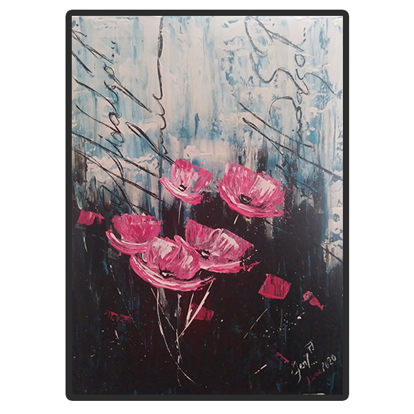Flores en tonos fucsia intenso emergen con fuerza sobre un fondo azul y negro cargado de energía. Los pétalos vibrantes parecen flotar en un espacio etéreo, llenando la obra de vitalidad y contraste. Mi jardín es una celebración de la naturaleza y el color, un rincón íntimo donde la vida florece con intensidad.