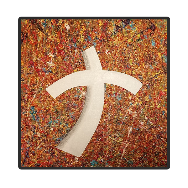Un fondo vibrante de colores cálidos y dinámicos enmarca una cruz blanca que se erige con pureza y fuerza en el centro de la composición. La técnica de salpicado crea un universo de energía que contrasta con la serenidad del símbolo central, evocando el poder transformador de la fe en medio del caos.