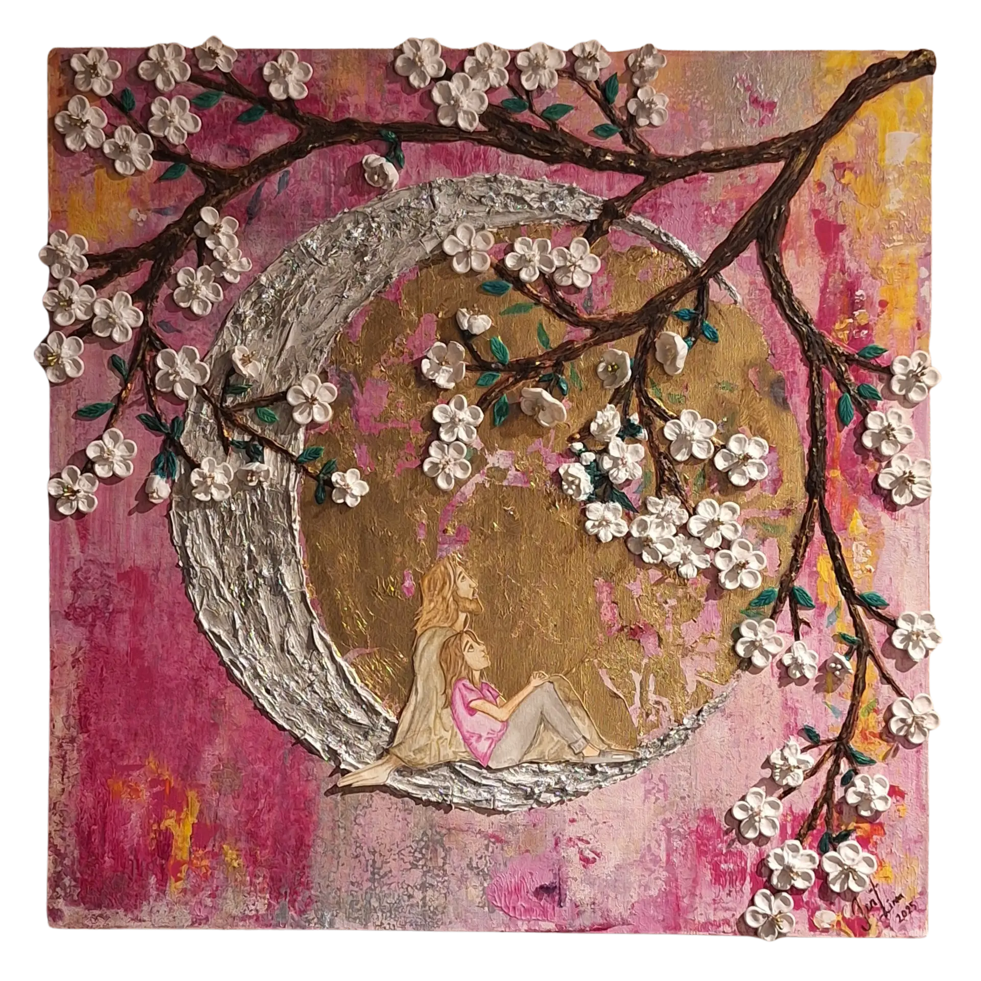 Inspirada en Salmos 19:1, esta obra refleja la intimidad espiritual y el asombro ante la creación divina. Una figura femenina se recuesta en la luna plateada bajo un cielo dorado, rodeada de flores en plena floración. El contraste de tonos cálidos y detalles en relieve transmite paz, contemplación y la belleza de detenerse a admirar la obra de Dios.