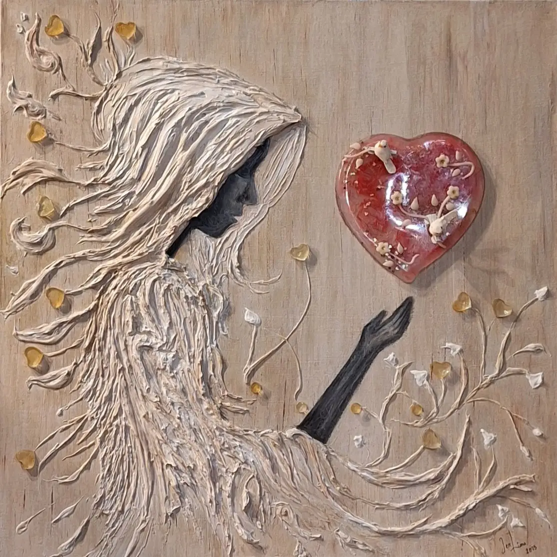 Inspirada en Salmos 36:9, esta obra representa la conexión divina como fuente de vida y luz. La figura femenina sostiene un corazón vibrante, símbolo del amor de Dios que transforma y hace florecer. Con relieves y texturas que acentúan el movimiento, la pieza transmite espiritualidad, gratitud y renovación interior.