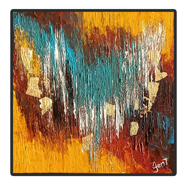 Con pinceladas verticales y texturas en relieve, la obra recrea la fuerza de la naturaleza a través de tonos verdes, dorados, ocres y turquesas. Los destellos metálicos sugieren la luz que atraviesa un bosque profundo, generando una atmósfera vibrante y misteriosa.